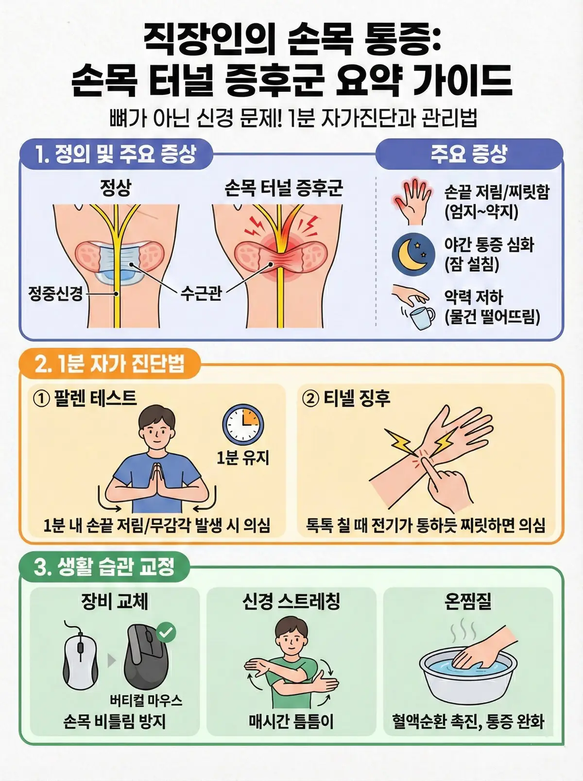 많은 분이 단순히 "일을 많이 해서 근육이 뭉쳤나 보다" 하고 파스만 붙이고 넘어가곤 합니다. 하지만 손목을 털거나 주물러도 시원하지 않고, 엄지부터 중지까지 손가락 끝이 찌릿찌릿 타는 듯한 통증이 계속된다면, 이것은 단순한 근육통이 아닙니다. 우리 몸의 신경 통로가 막혔다는 위험 신호, 바로 '손목 터널 증후군(수근관 증후군)'일 가능성이 매우 높습니다.